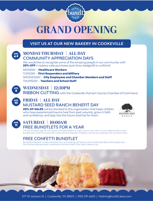 Join us in celebrating the grand opening of Nothing Bundt Cakes in Cookeville! Locally owned and operated by Paul Teller, Nothing Bundt Cakes is known nationally for bringing joy to every occasion. The bakery offers a delicious selection of signature Bundt cakes perfect for celebrating life’s sweetest moments.